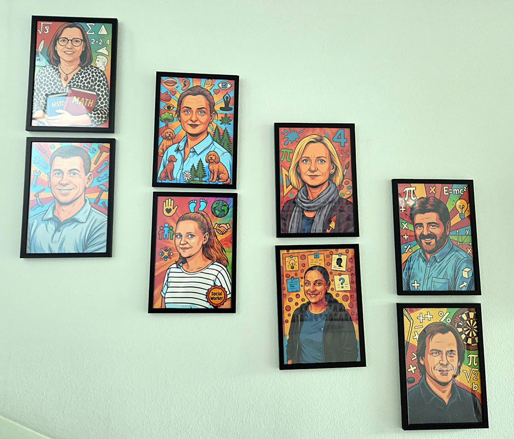 An den Wänden hängen nun KI-generierte Porträts aller Mitarbeiter:innen unserer Schule – von den Lehrer:innen über die Sozialpädagoginnen und die Verwaltungskraft bis hin zu unserem Hausmeister. Jedes Bild zeigt die jeweilige Person auf individuelle Weise und ist mit Symbolen geschmückt, die ihre Fächer, Aufgaben oder auch persönlichen Hobbys widerspiegeln.