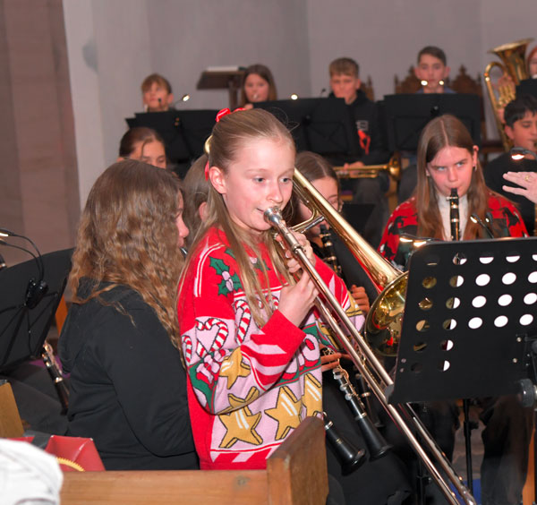 Besonders vielfältig präsentierte sich die Bläserklasse 7c mit den Werken „Vom Himmel hoch“, „Am Weihnachtsbaume“, „Hark! The Herald Angels Sing“ und „Stille Nacht“. Bei „Am Weihnachtsbaume“ beeindruckte Carla Edler als Solistin an der Posaune, während bei „Stille Nacht“ Emilia Garre mit einem gefühlvollen Euphonium-Solo glänzte.