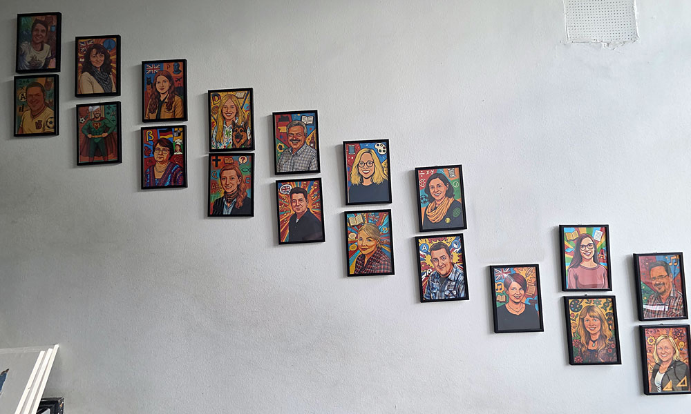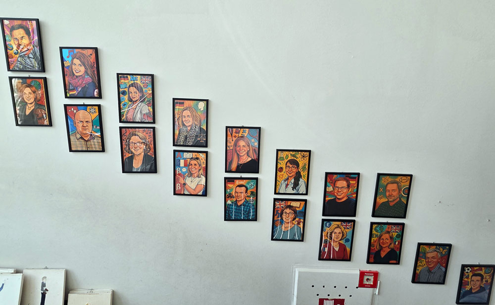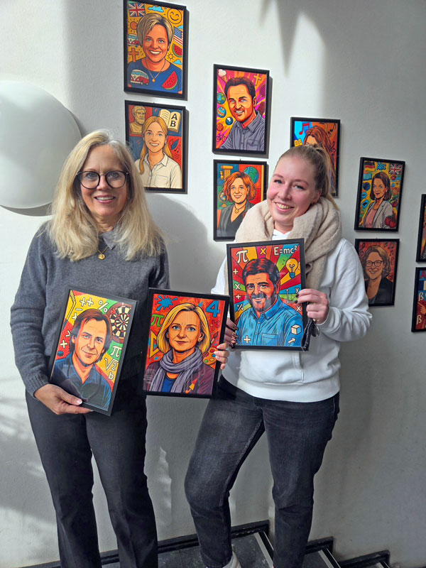 An den Wänden hängen nun KI-generierte Porträts aller Mitarbeiter:innen unserer Schule – von den Lehrer:innen über die Sozialpädagoginnen und die Verwaltungskraft bis hin zu unserem Hausmeister. Jedes Bild zeigt die jeweilige Person auf individuelle Weise und ist mit Symbolen geschmückt, die ihre Fächer, Aufgaben oder auch persönlichen Hobbys widerspiegeln.